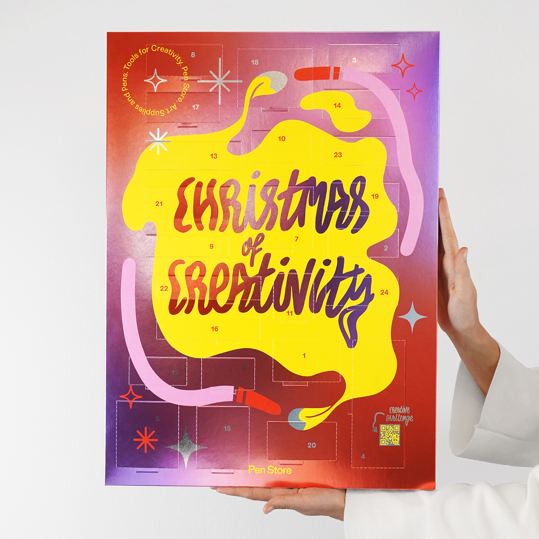 De kalender van dit jaar schittert als een kerstbal en bevat producten van enkele van de beste fabrikanten: Sakura, Aquafine, Sennelier, Platinum, Staedtler, Sharpie, Primo, Pilot, Amsterdam, Leuchtturm1917, Lyra, Stabilo, Giotto, ZIG Kuretake, Ecoline, Rhodia, Raphael en Blockx.