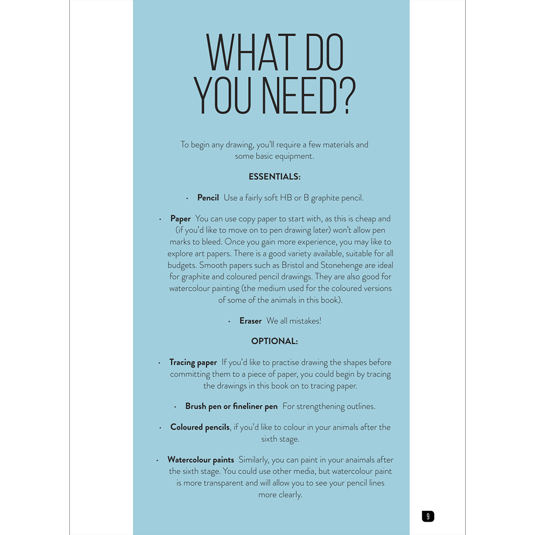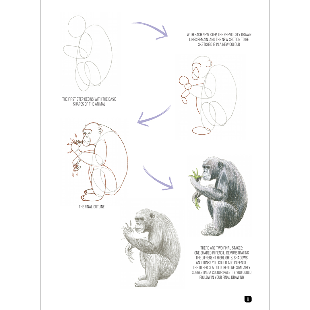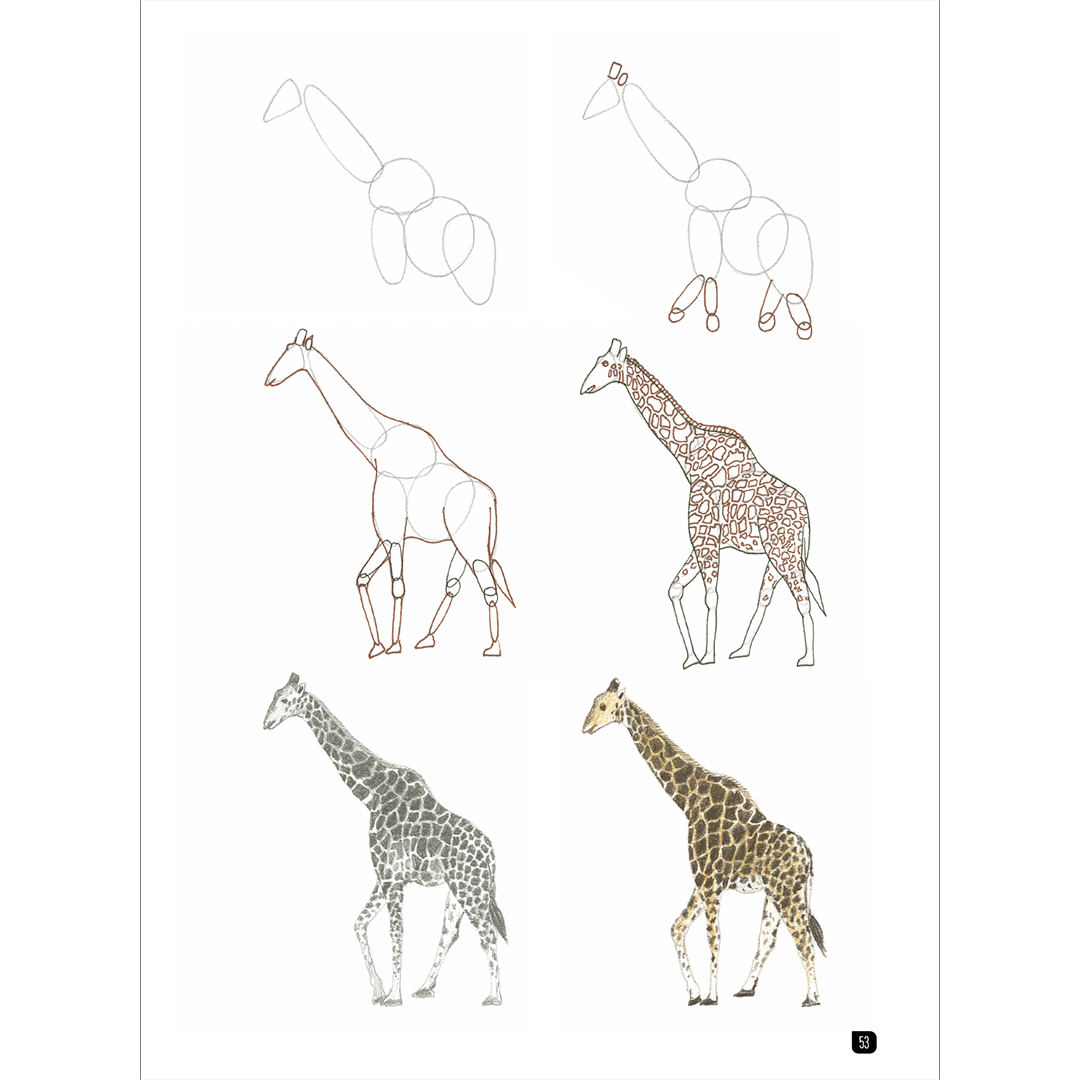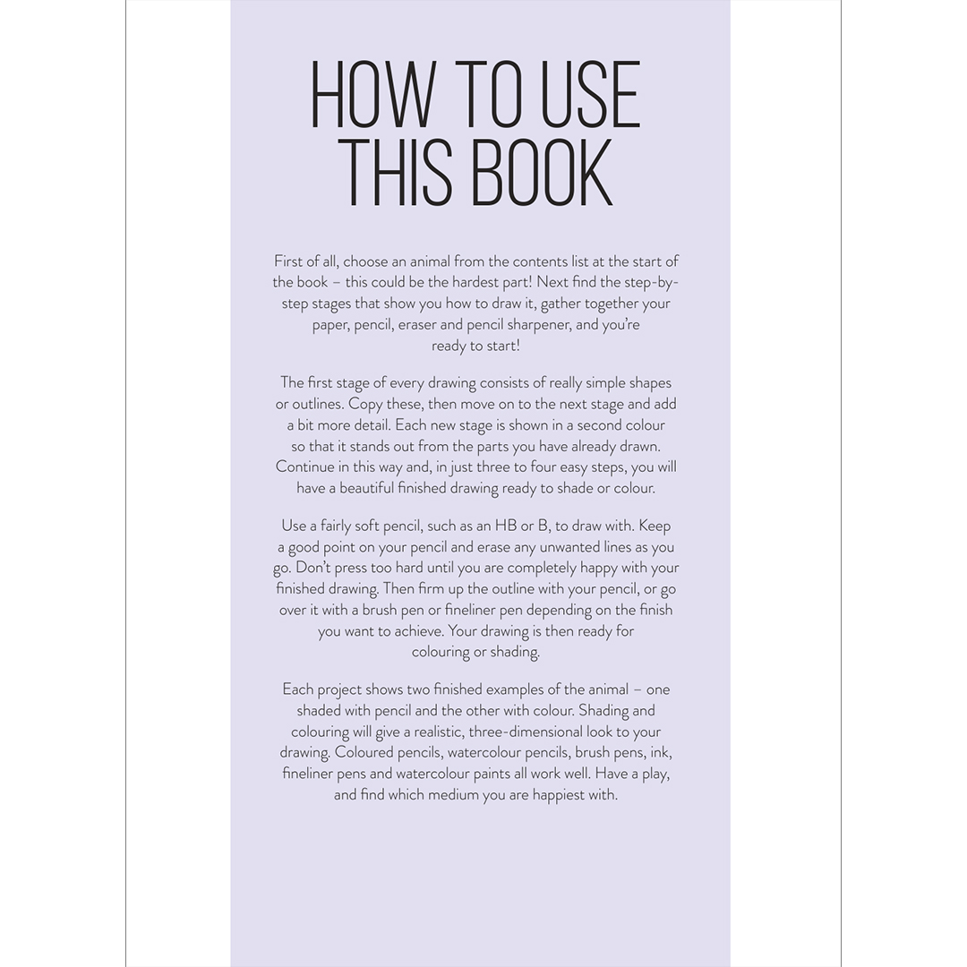 Elk dier is opgedeeld in drie of vier eenvoudige stappen die je moeiteloos naar de voltooide tekening leiden. Er zijn geen geschreven instructies – alleen basisvormen en potloodstreken. Zelfs als je nog nooit iets hebt getekend, zul je versteld staan van hoe snel je indrukwekkende tekeningen kunt maken. Elk project toont bovendien twee afgewerkte voorbeelden van het dier – één gearceerd met potlood en één in kleur.
