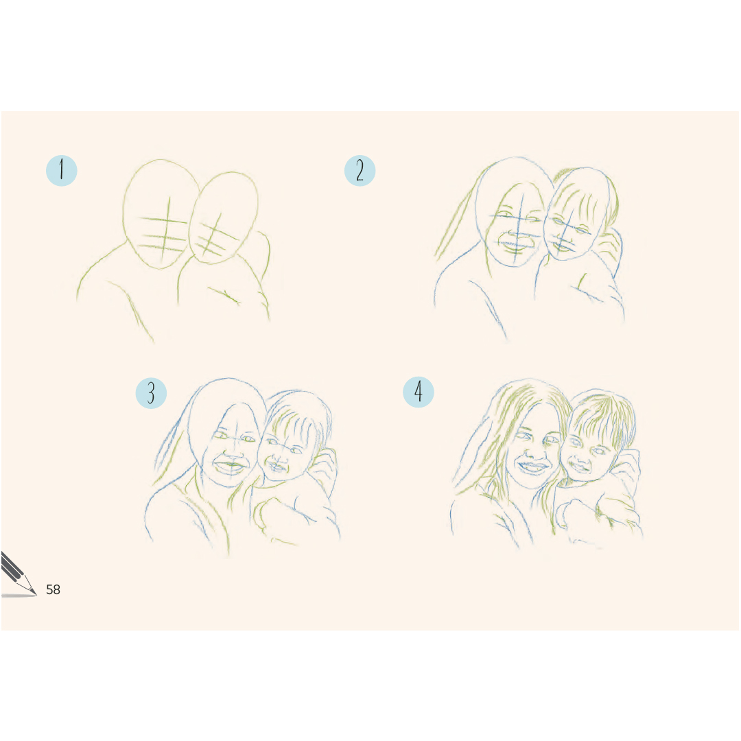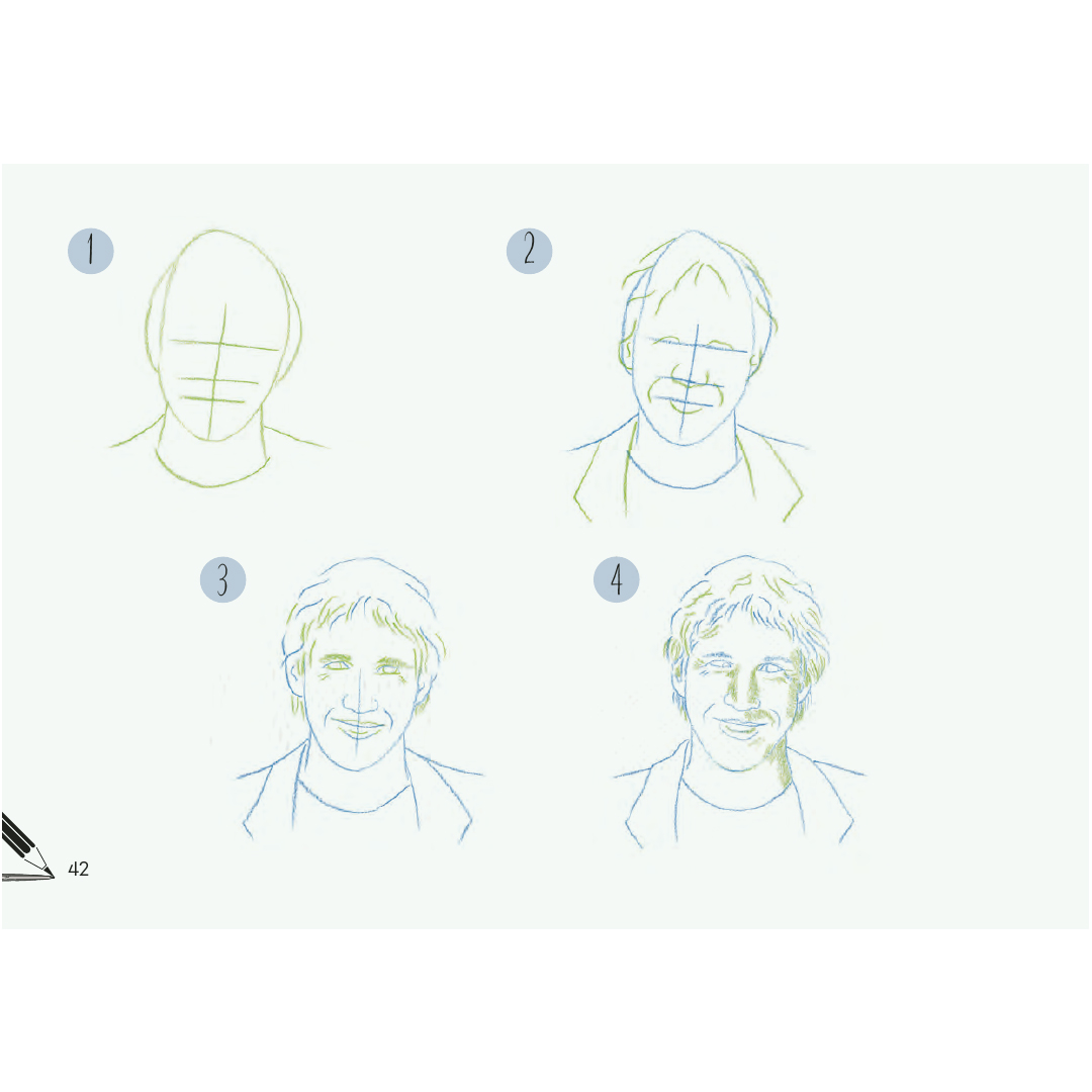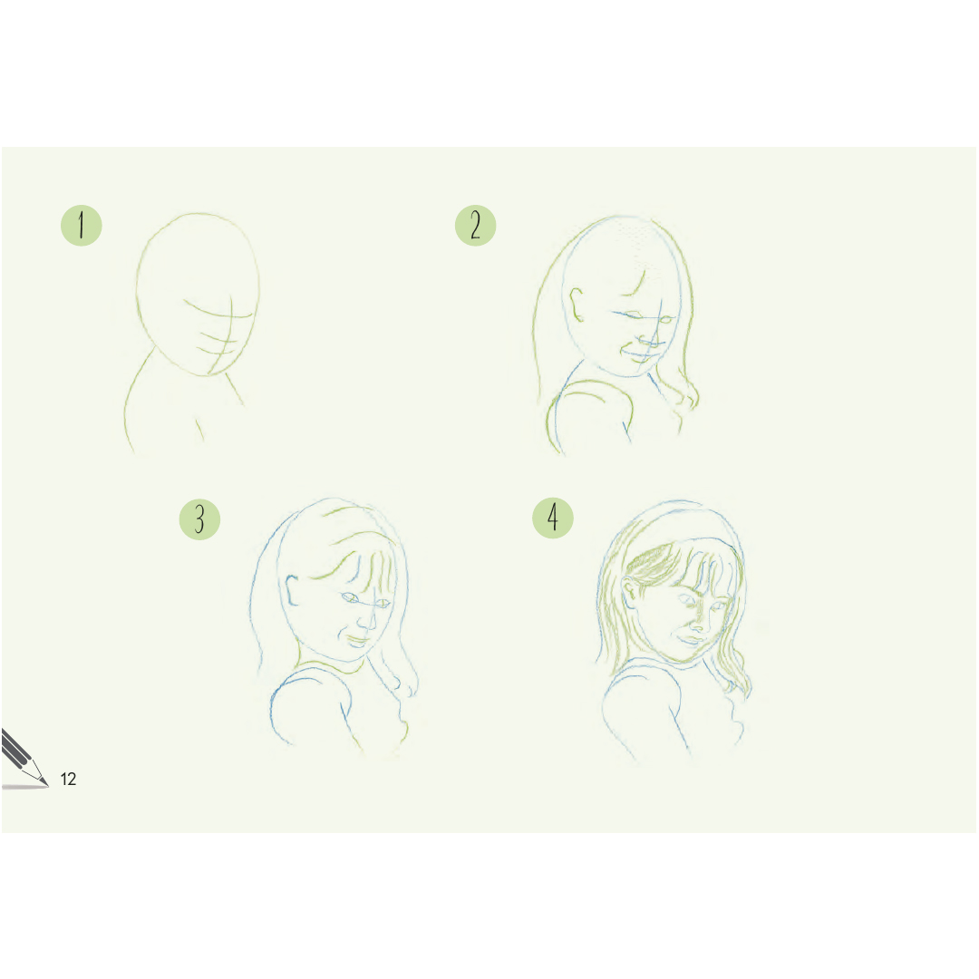 In maximaal 6 eenvoudige stappen leer je de beelden geleidelijk op te bouwen van basisgeometrische vormen tot het afgewerkte gezicht, met een duidelijke tweekleurenmethode die precies laat zien hoe de lijnen worden opgebouwd en vervolgens verfijnd.