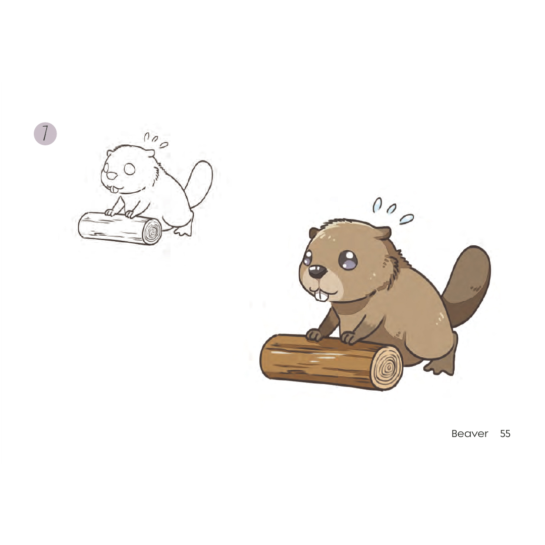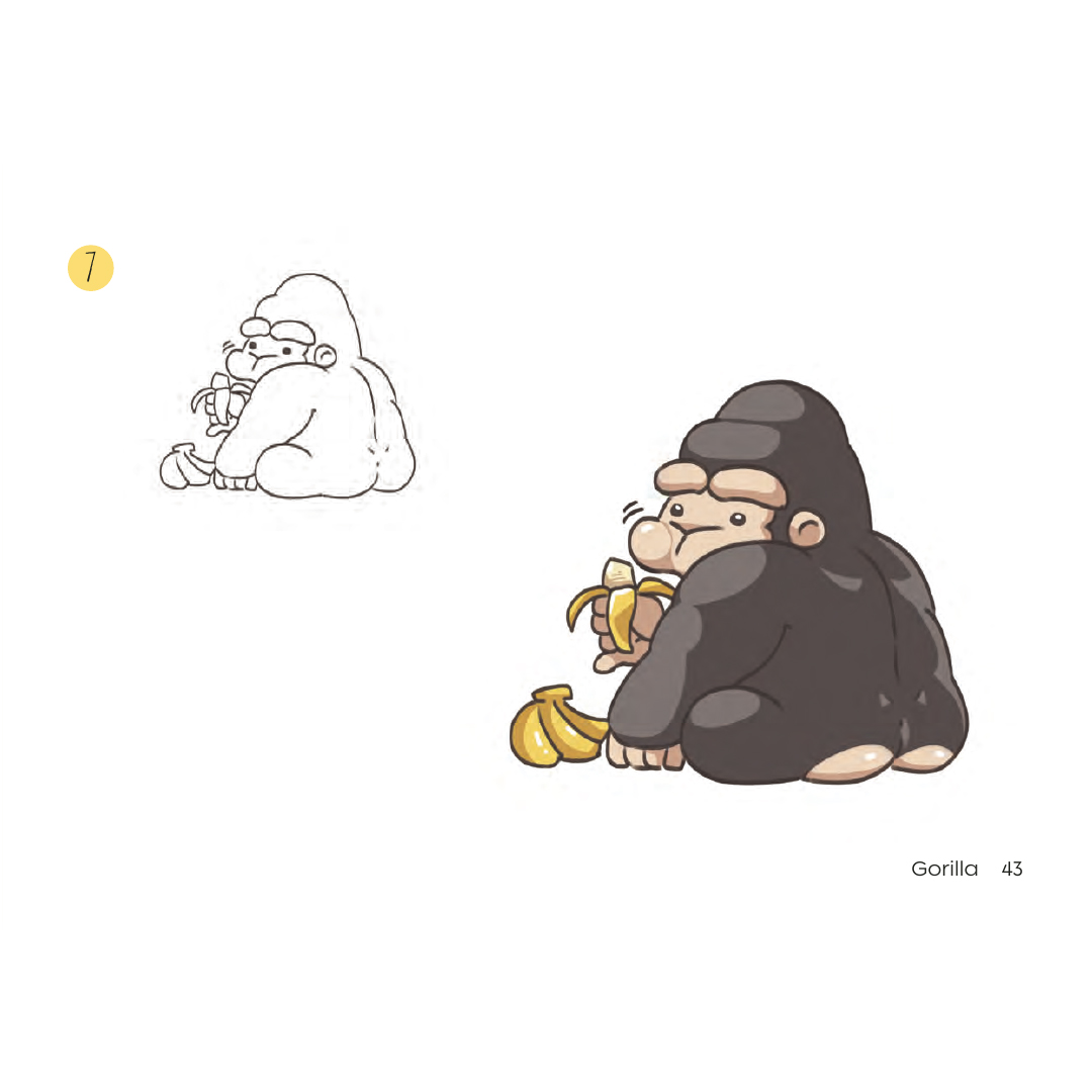 Elk dier wordt opgebouwd in 8 eenvoudige stappen, van een ruwe schets van de basisvormen tot de afgewerkte, ingekleurde tekening, met een eenvoudige tweekleurenmethode die elke stap duidelijk laat zien.