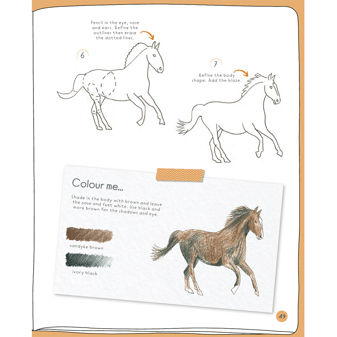 Elk project bevat tussen de 6 en 10 geïllustreerde stappen, eenvoudige instructies en een inspirerende ‘kleur mij’-box met kleurstalen en advies, voor het geval je je tekening wilt inkleuren. In Jonathans voorbeelden worden kleurpotloden gebruikt, maar je kunt elk medium gebruiken dat je wilt.