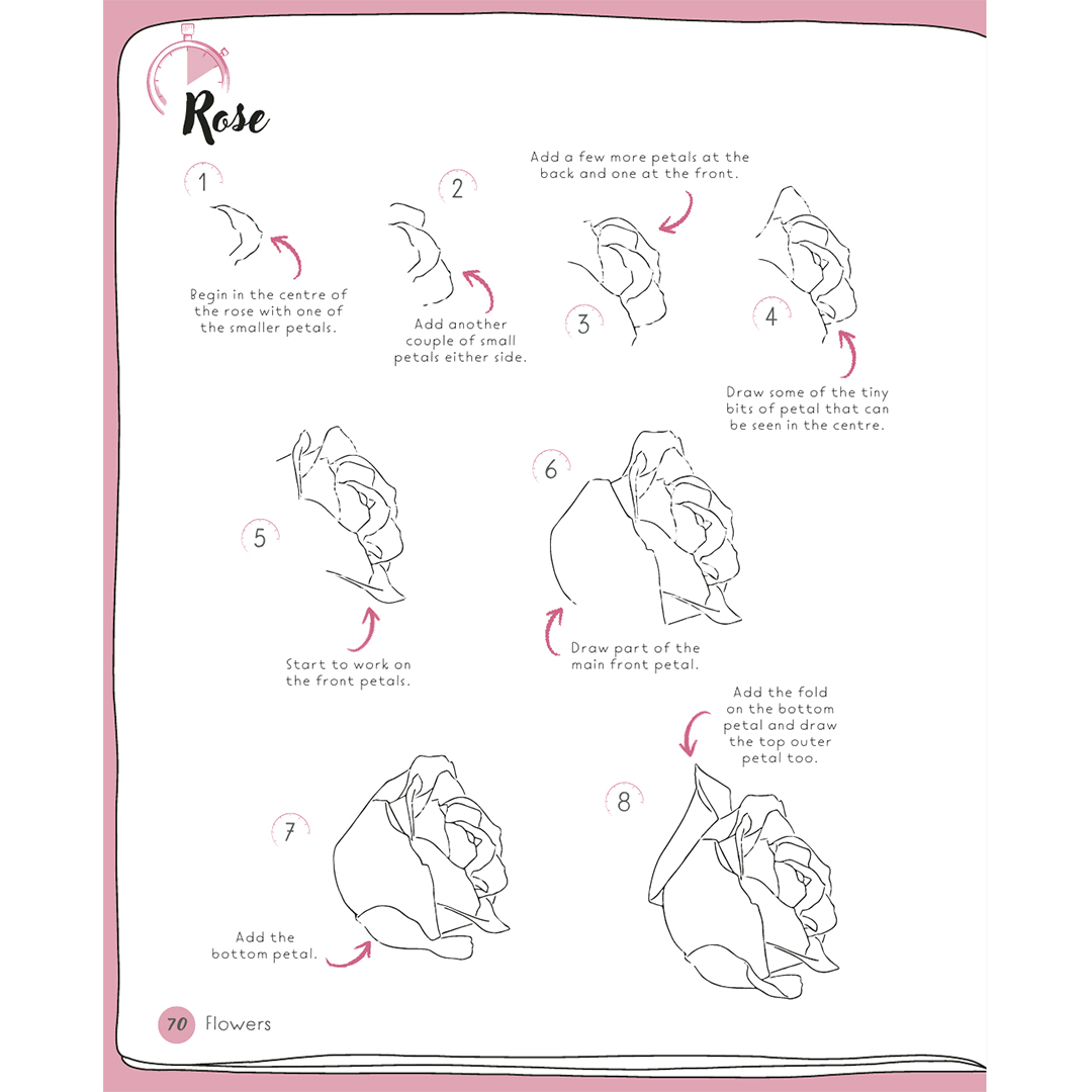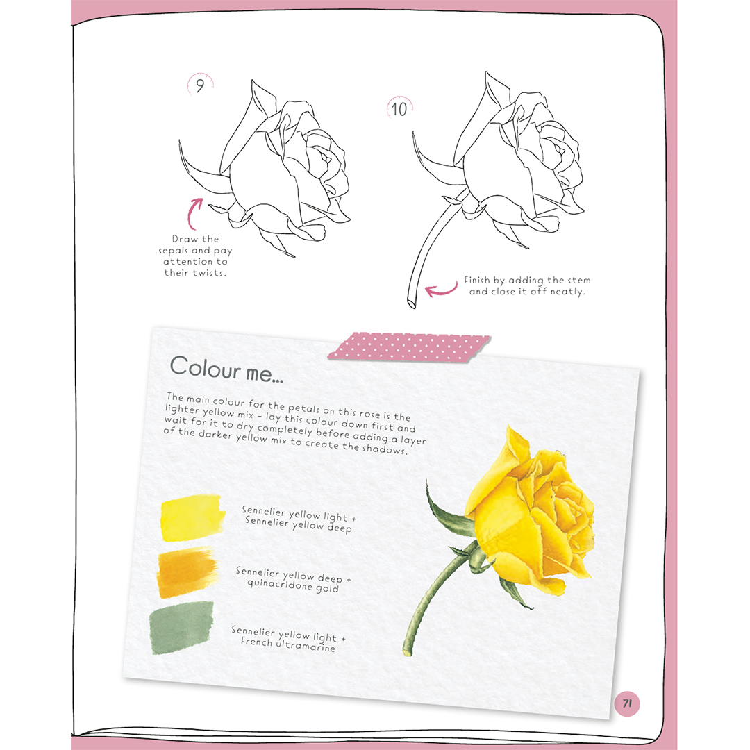 Elk project bevat tussen de 6 en 10 geïllustreerde stappen, eenvoudige instructies en een inspirerende ‘kleur mij’-box met kleurmengsels en advies, voor het geval je je tekening wilt inkleuren – in Emma’s geval worden aquarelverf gebruikt, maar je kunt elk medium gebruiken dat je wilt.