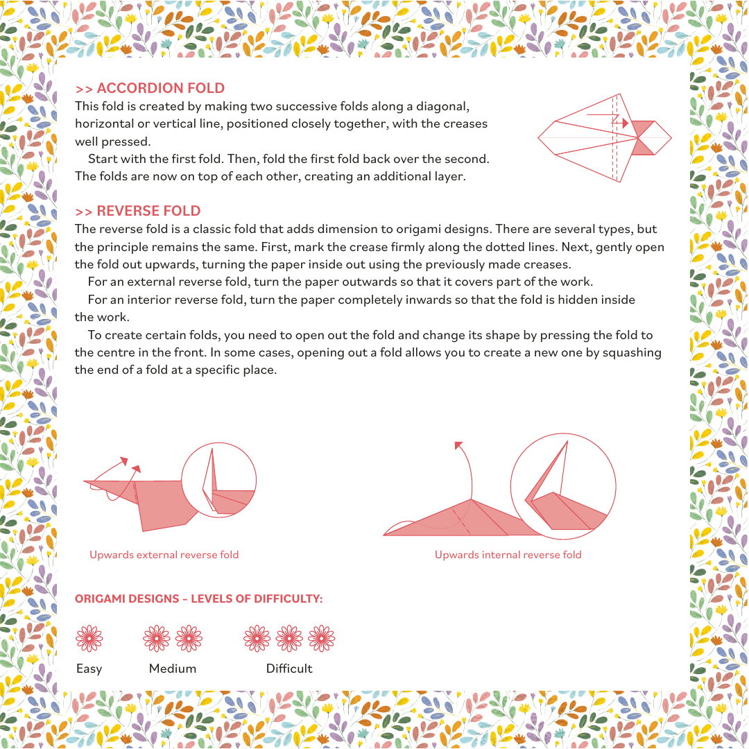 - Het boek begint met een introductie tot basisvouwtechnieken, waaronder horizontale, verticale en diagonale vouwen, evenals meer geavanceerde technieken zoals de omgekeerde vouw en de accordeonvouw.