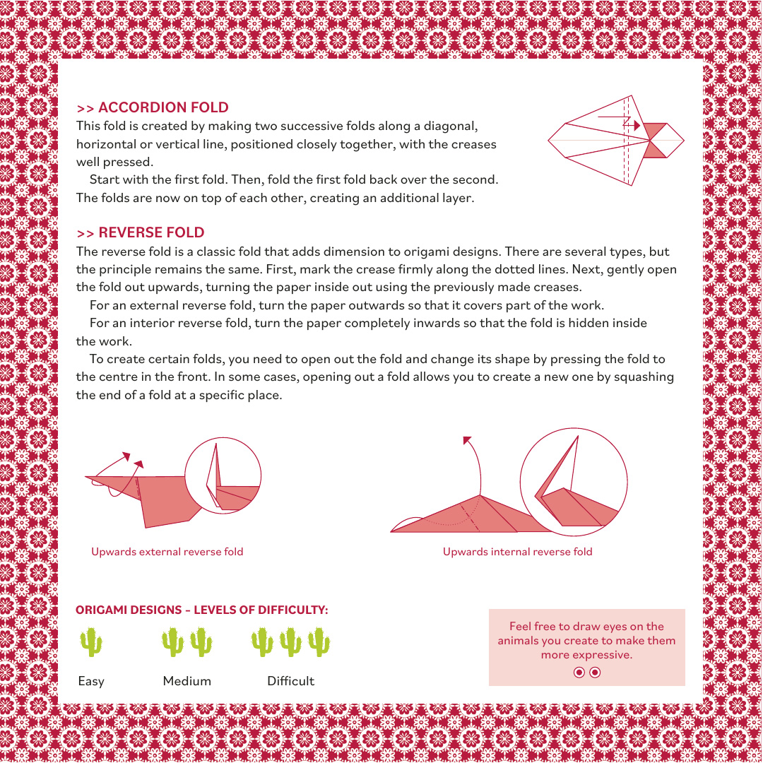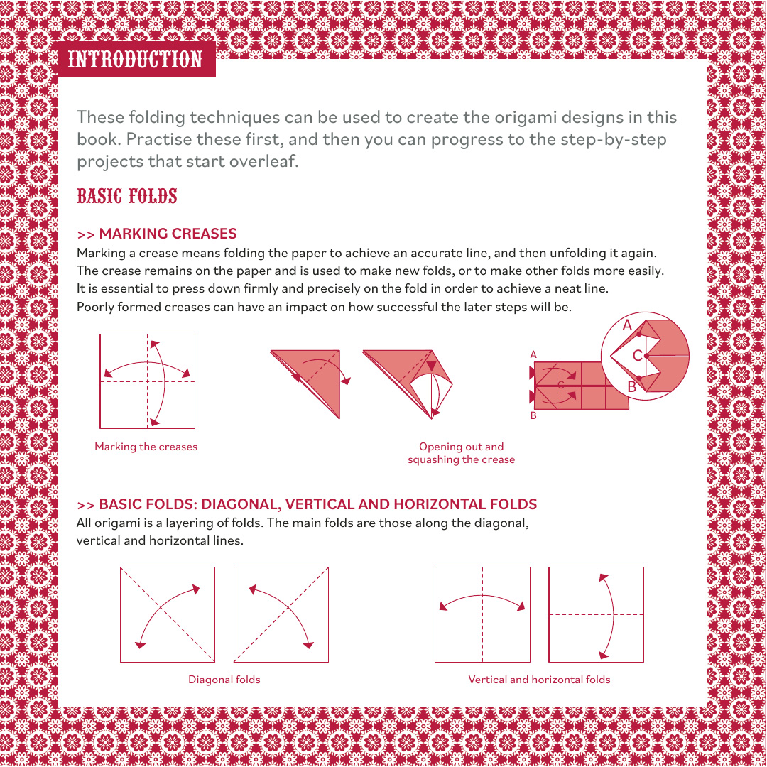 - Het boek begint met een introductie tot basisvouwtechnieken, waaronder horizontale, verticale en diagonale vouwen, evenals meer geavanceerde technieken zoals de omgekeerde vouw en de accordeonvouw.