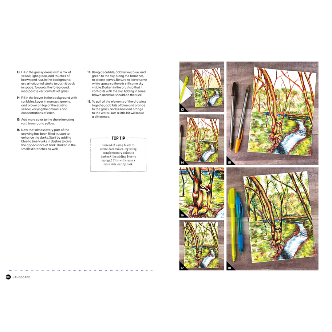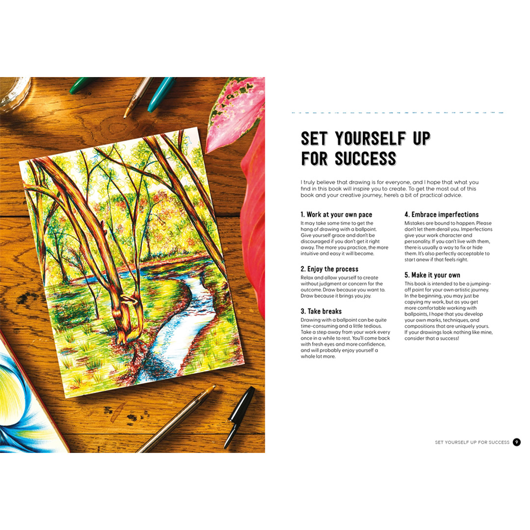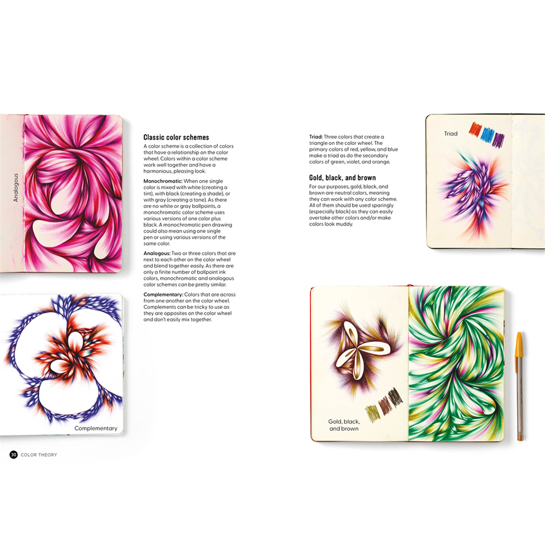 Ontdek de kunst, voldoening en het plezier van tekenen met één, twee, drie of meer kleuren met een balpen.