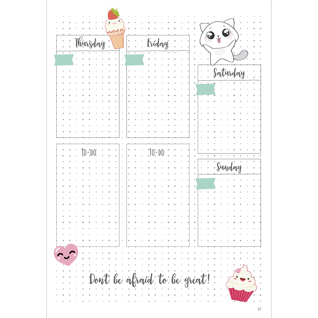 Een Bullet Journal kan gebruikt worden als kalender, dagboek, organizer, gewoonte-tracker of alles tegelijk. Maar niet iedereen heeft de tijd of ideeën om de pagina's zelf te ontwerpen. My Kawaii Journal is de perfecte oplossing, met voorontworpen pagina's met schattige kunst die je kunt vullen met lijsten, doelen, plannen, geheimen en dromen.