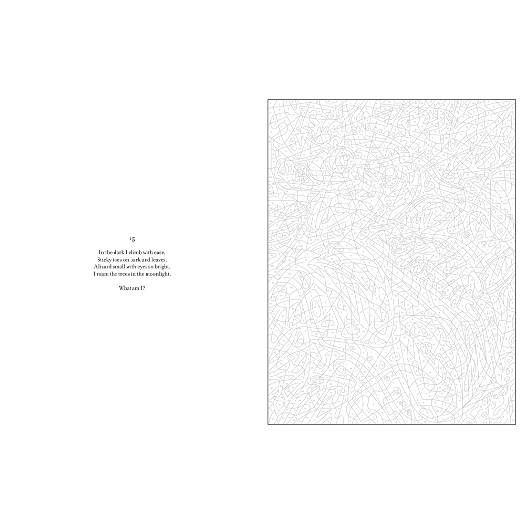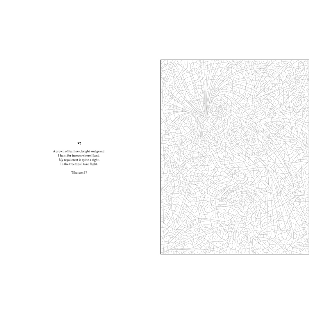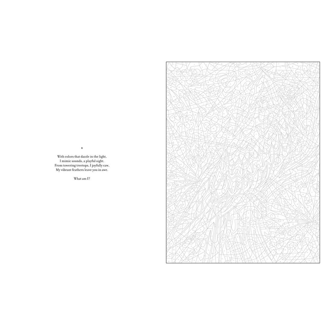 - Voor extra plezier bevat elke illustratie een raadsel om over na te denken terwijl je het kunstwerk tot leven brengt. Ontdek de antwoorden in woorden en beelden achter in het boek.