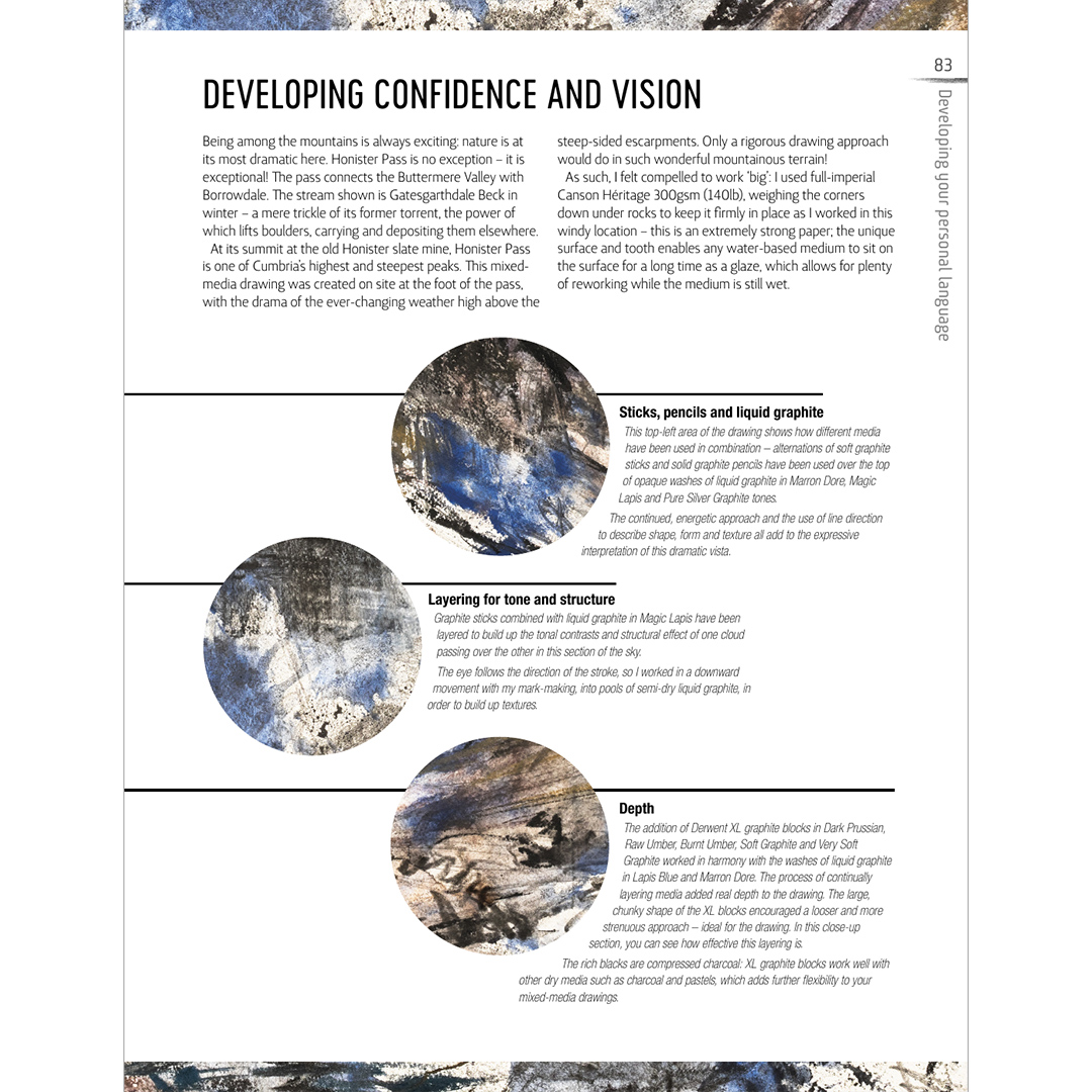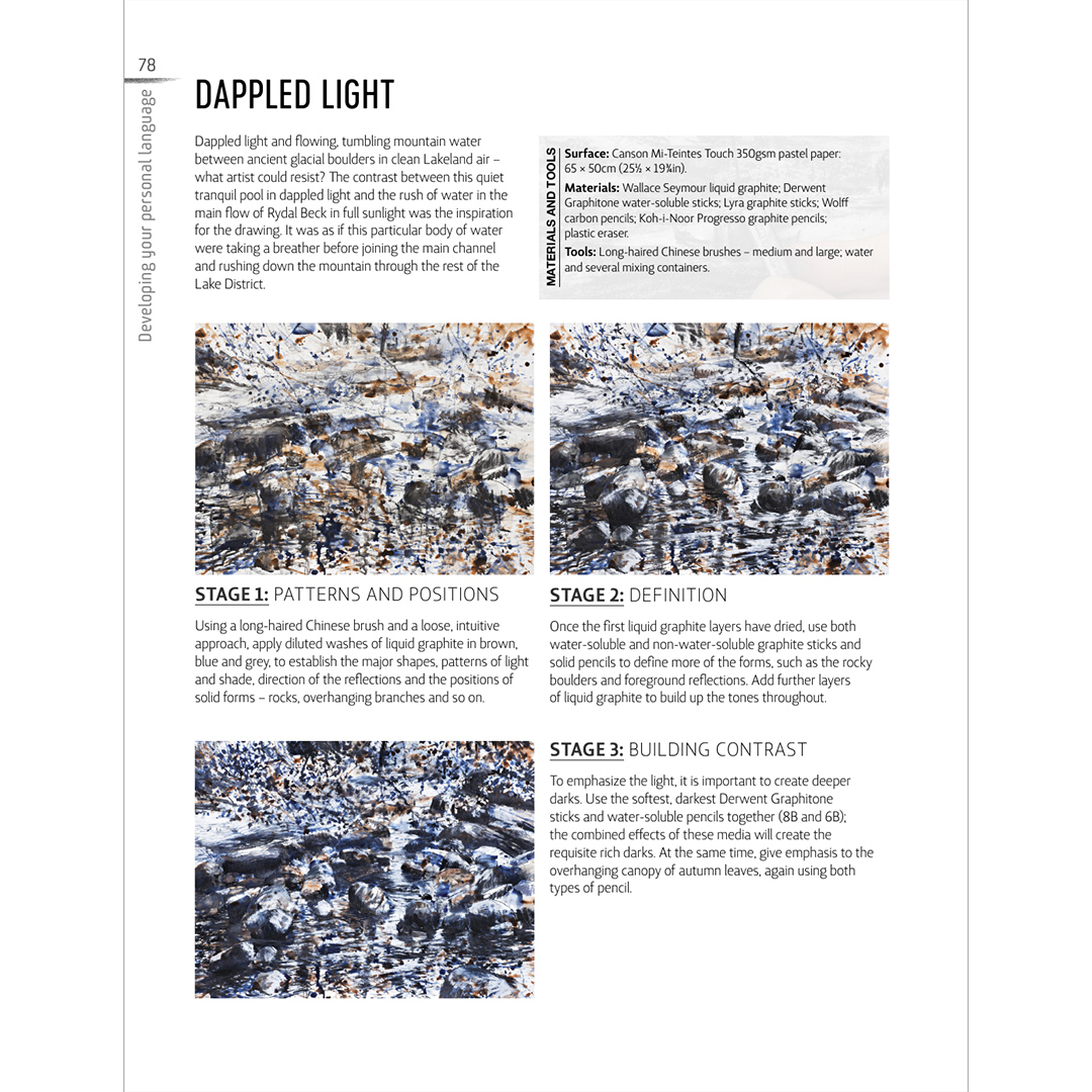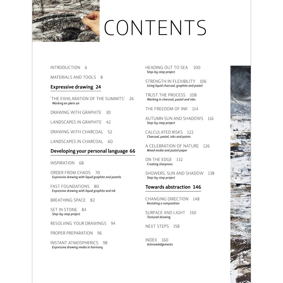 Dit boek is bedoeld voor kunstenaars die nieuwe manieren willen verkennen om verschillende tekenmaterialen te gebruiken om expressieve en dramatische landschappen te maken. Kunstenaar en auteur Robert Dutton gebruikt zijn krachtige en vrije teken- en schilderstijl om de sfeer, kracht en dramatiek van het landschap vast te leggen. Hij combineert materialen zoals vloeibaar grafiet, inkt, metallic inkt, houtskool en wateroplosbare krijt- en pastelsoorten, en experimenteert ook met collage.