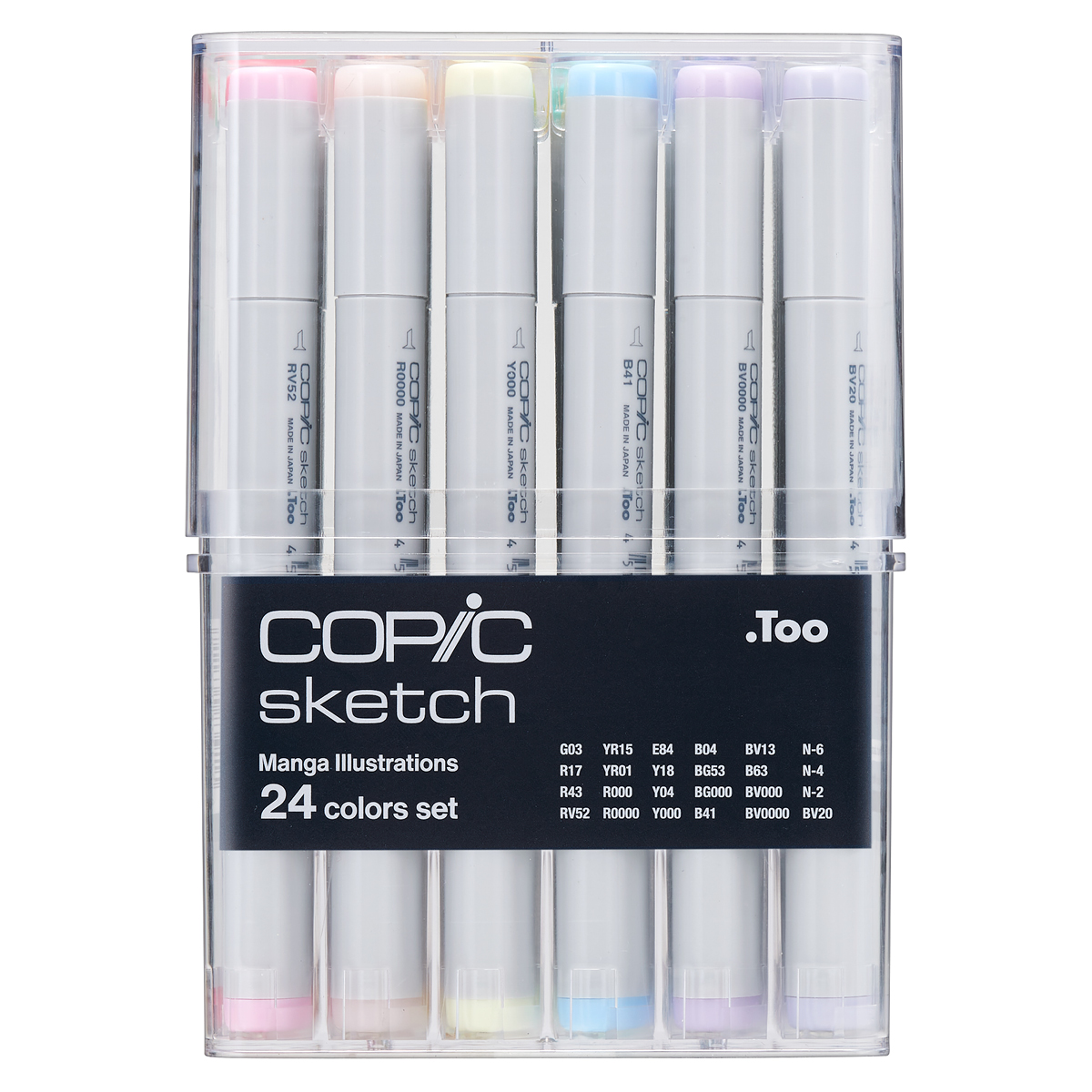 Copic Sketch markers in een set van 24. De markers worden geleverd in een transparante bewaardoos. De set bevat 24 verschillende kleuren.