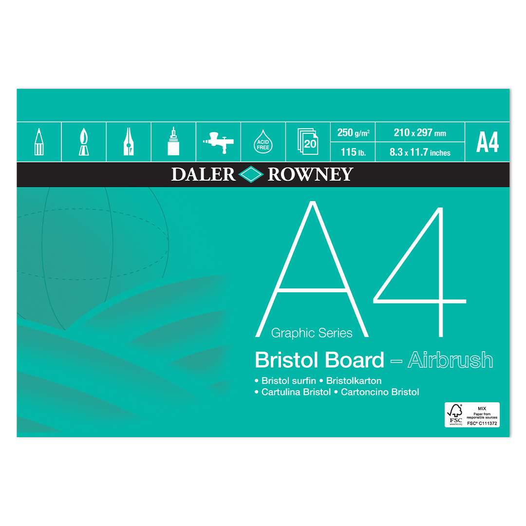 Daler-Rowney Bristol Board is een zeer sterk papier met een coating geschikt voor airbrush. Is ook geschikt voor viltstiften, inkt, penselen en (kleur)potloden. 20 gelijmde vellen per blok. Gewicht/m2: 250 g.