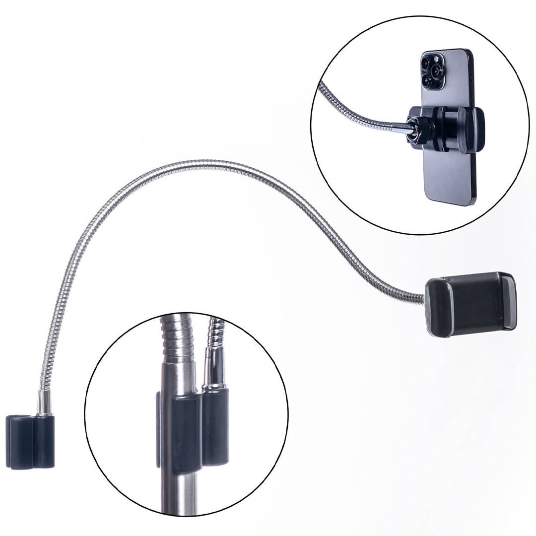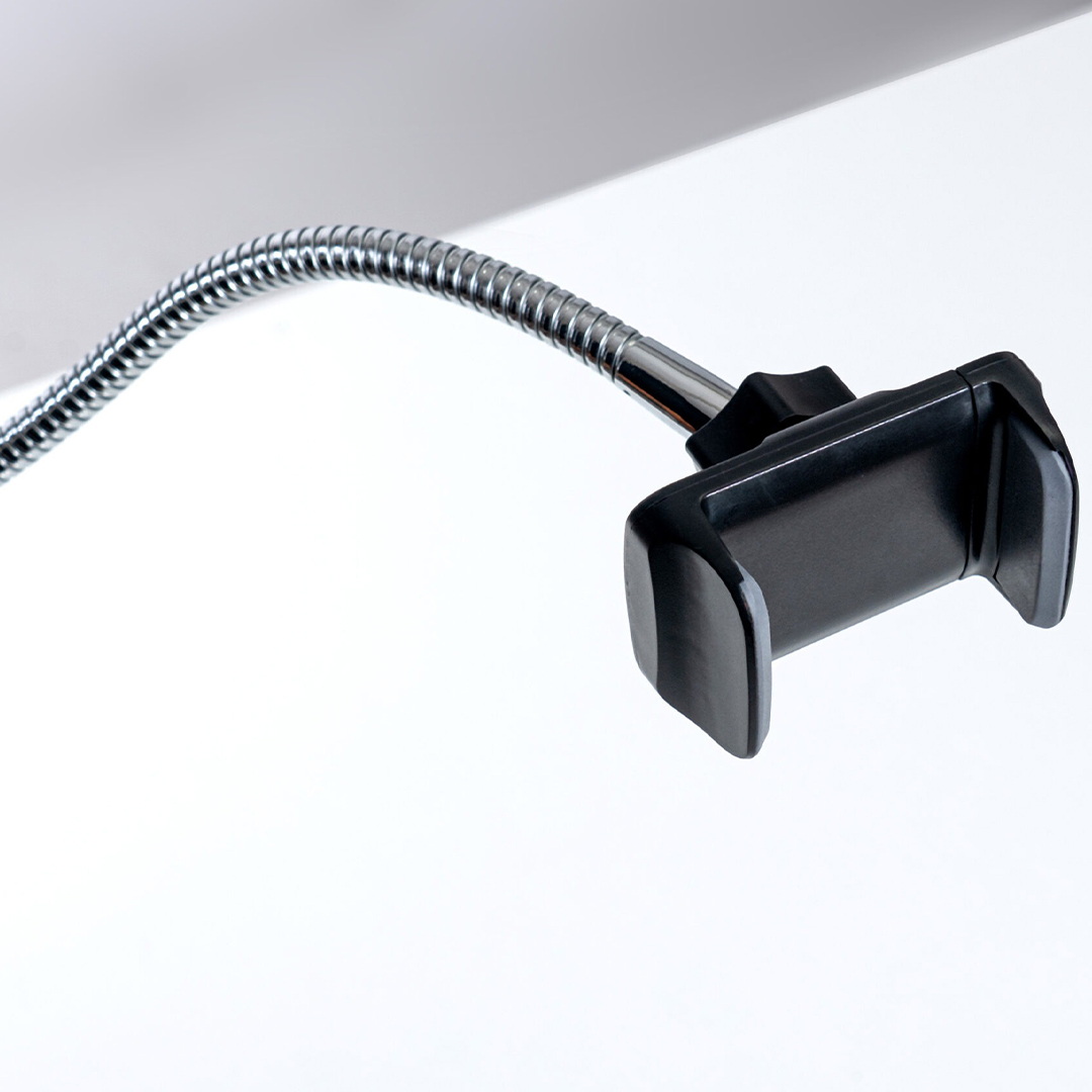 Dankzij het praktische ontwerp kan de Flexi Phone Holder snel en gemakkelijk zonder gereedschap aan de lampsteel worden gemonteerd en gedemonteerd.