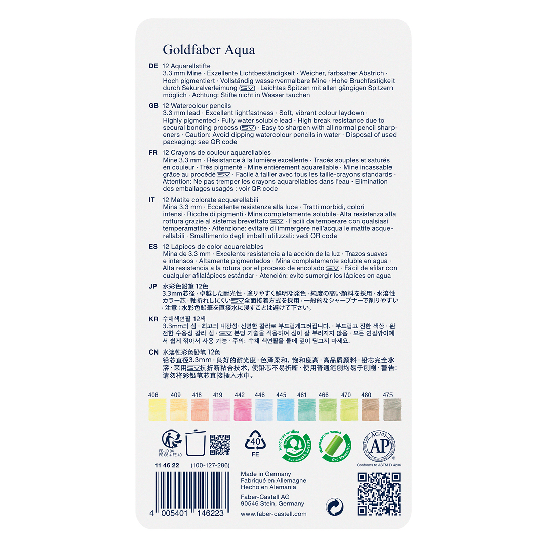 Goldfaber aquarelpotloden van Faber-Castell bieden een zeer zachte schrijfervaring en intense en mooie kleuren als resultaat. De aquarelpotloden hebben pigment van hoge kwaliteit en een hoge lichtbestendigheid.