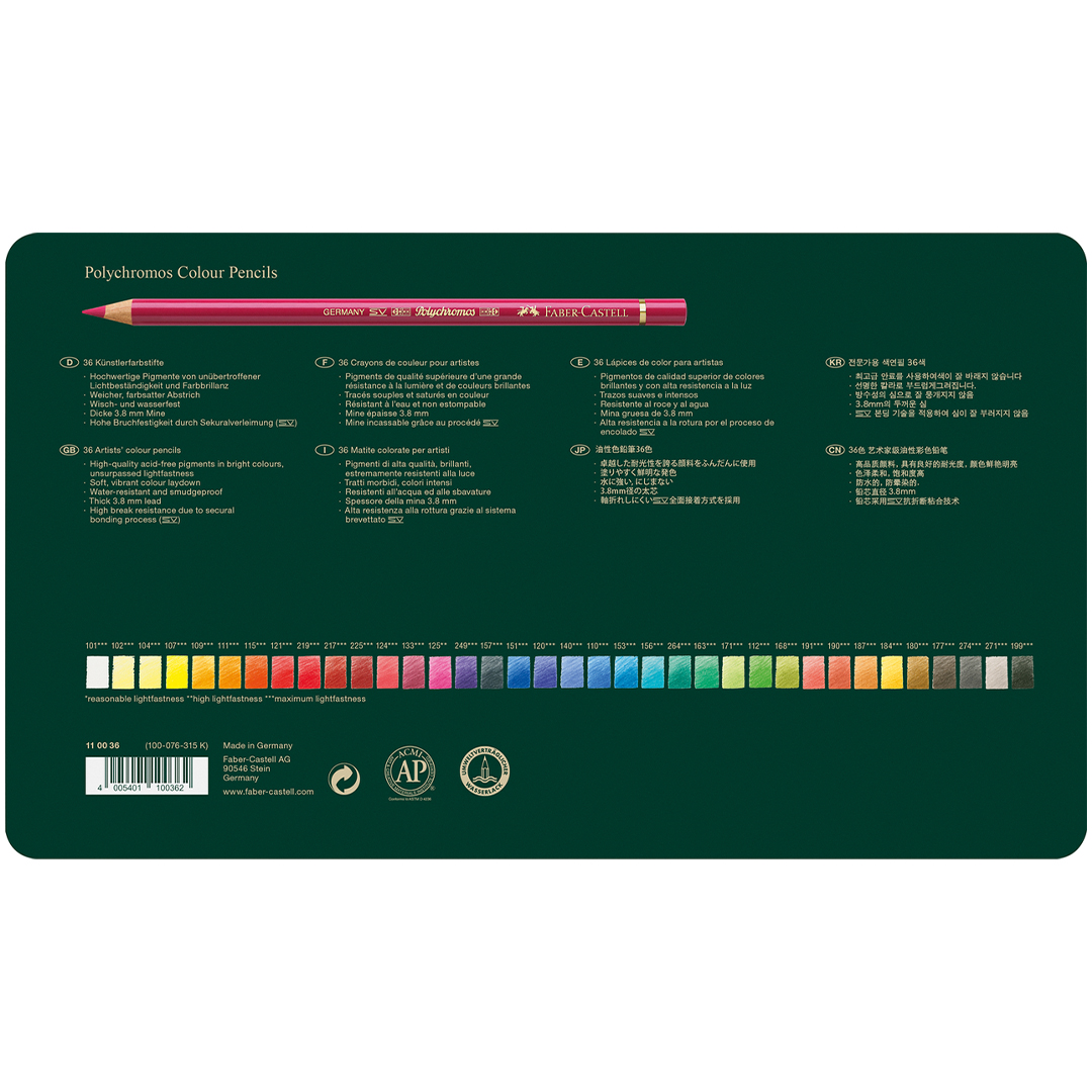 Dit set bevat 36 Polychromos in verschillende kleuren, verpakt in een stevig metalen etui.