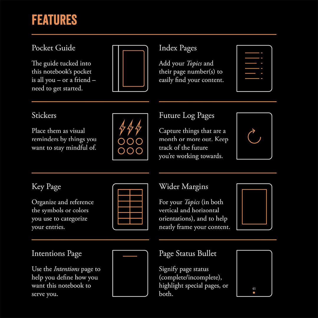 Een aparte gids met inspiratie en tips voor je bujo-inrichting wordt meegeleverd. Onze tip is om je Bullet Journal A5 aan te vullen met de Bullet Journal Pocket die in de binnenzak van het boek past (apart verkrijgbaar).