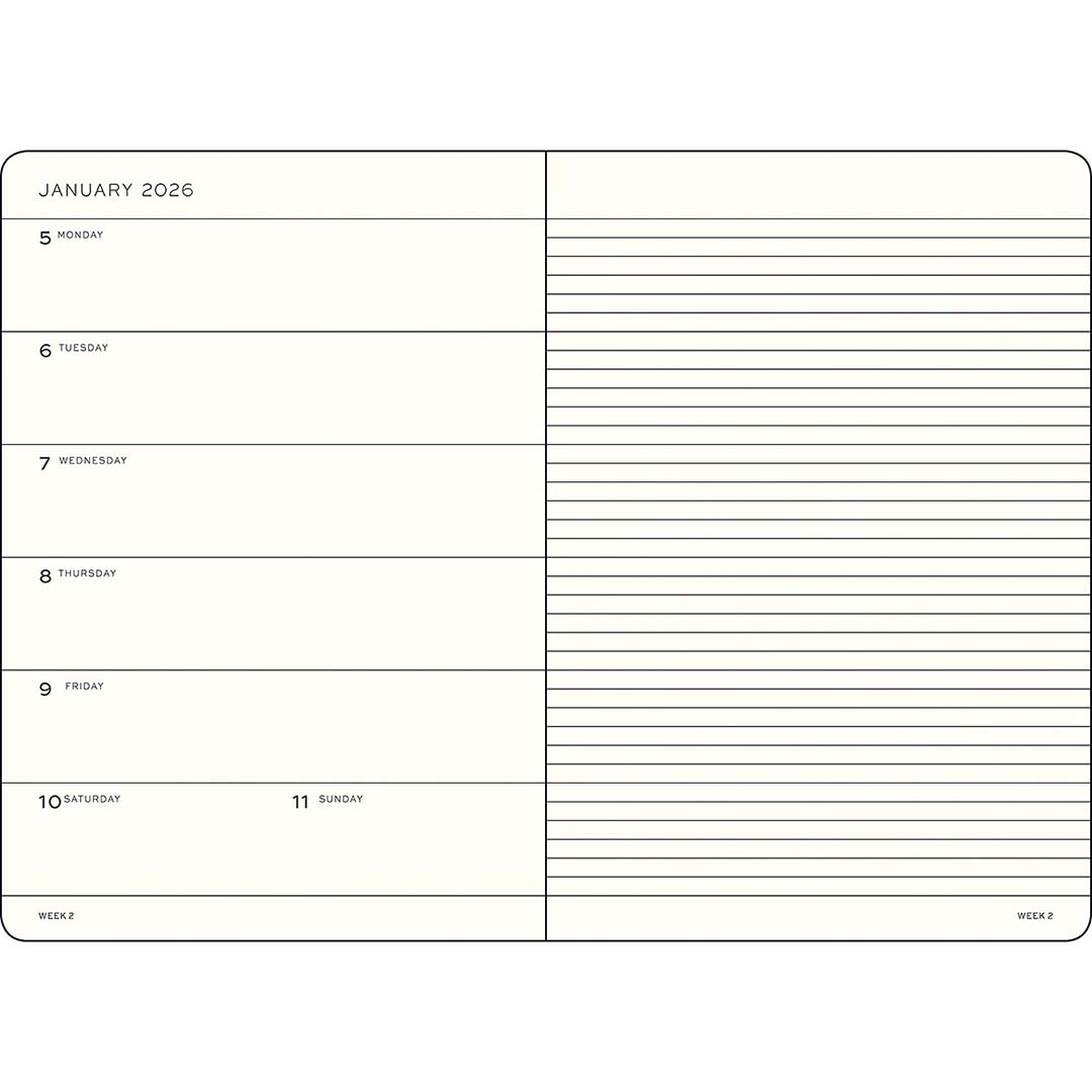 Plan je jaar met een kalender van Leuchtturm1917 in A5-formaat met een zachte kaft. De “Weekly Planner and Notebook” heeft links een weekoverzicht en rechts ruimte voor notities. De lay-out biedt volop ruimte voor planning, organisatie en notities.