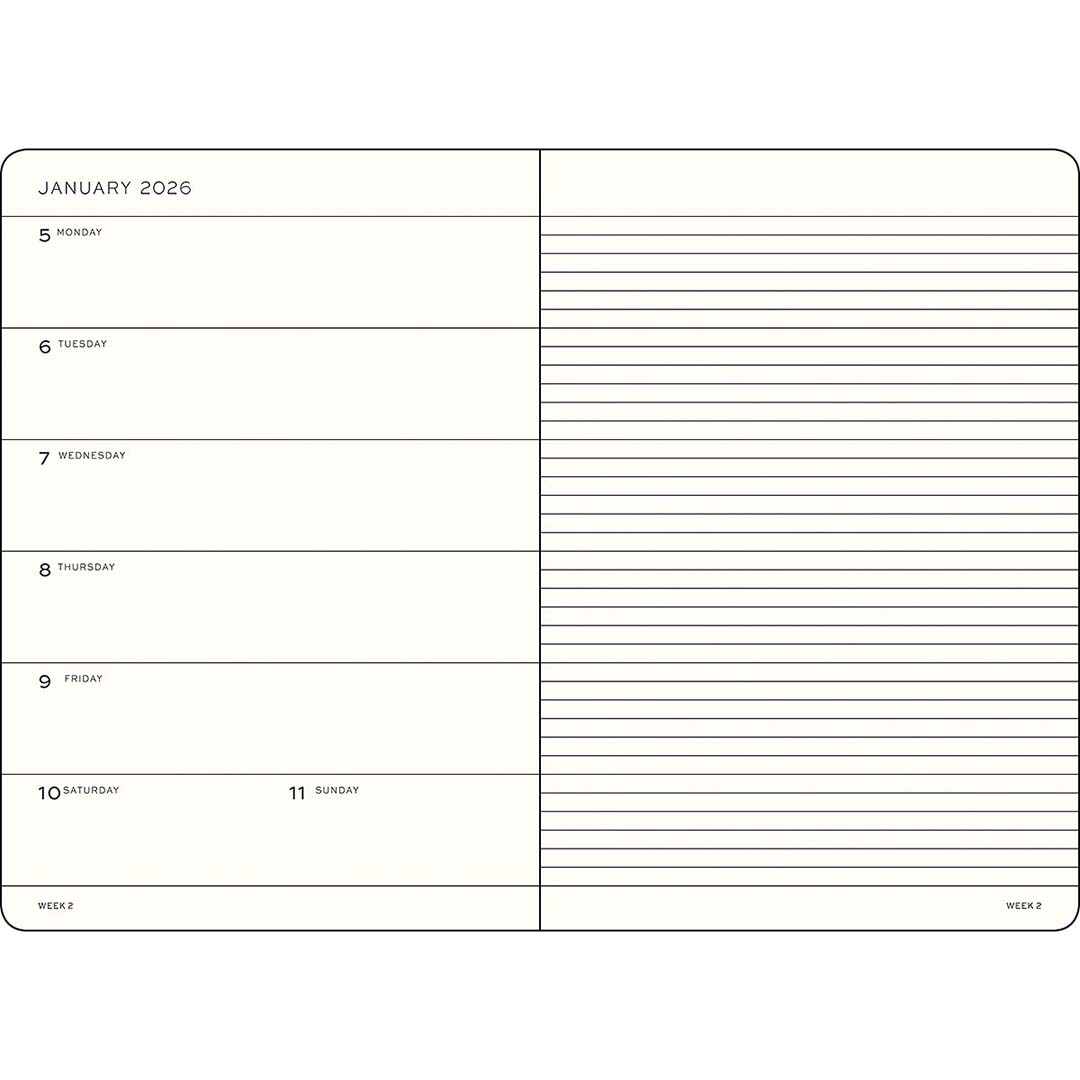 Plan je jaar met een kalender van Leuchtturm1917 in A5-formaat met een zachte kaft. De “Weekly Planner and Notebook” heeft links een weekoverzicht en rechts ruimte voor notities. De lay-out biedt volop ruimte voor planning, organisatie en notities.