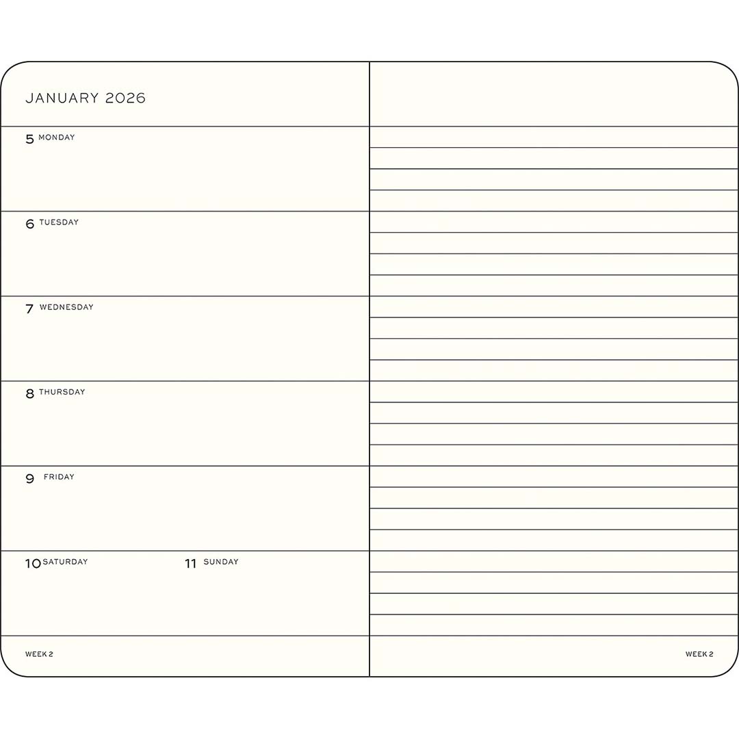 Plan je jaar met een kalender van Leuchtturm1917 in een handig A6-formaat met harde kaft. De “Weekly Planner and Notebook” biedt een weekoverzicht op de linkerpagina en ruimte voor notities op de rechterpagina. De indeling biedt plaats voor planning, organisatie en aantekeningen.