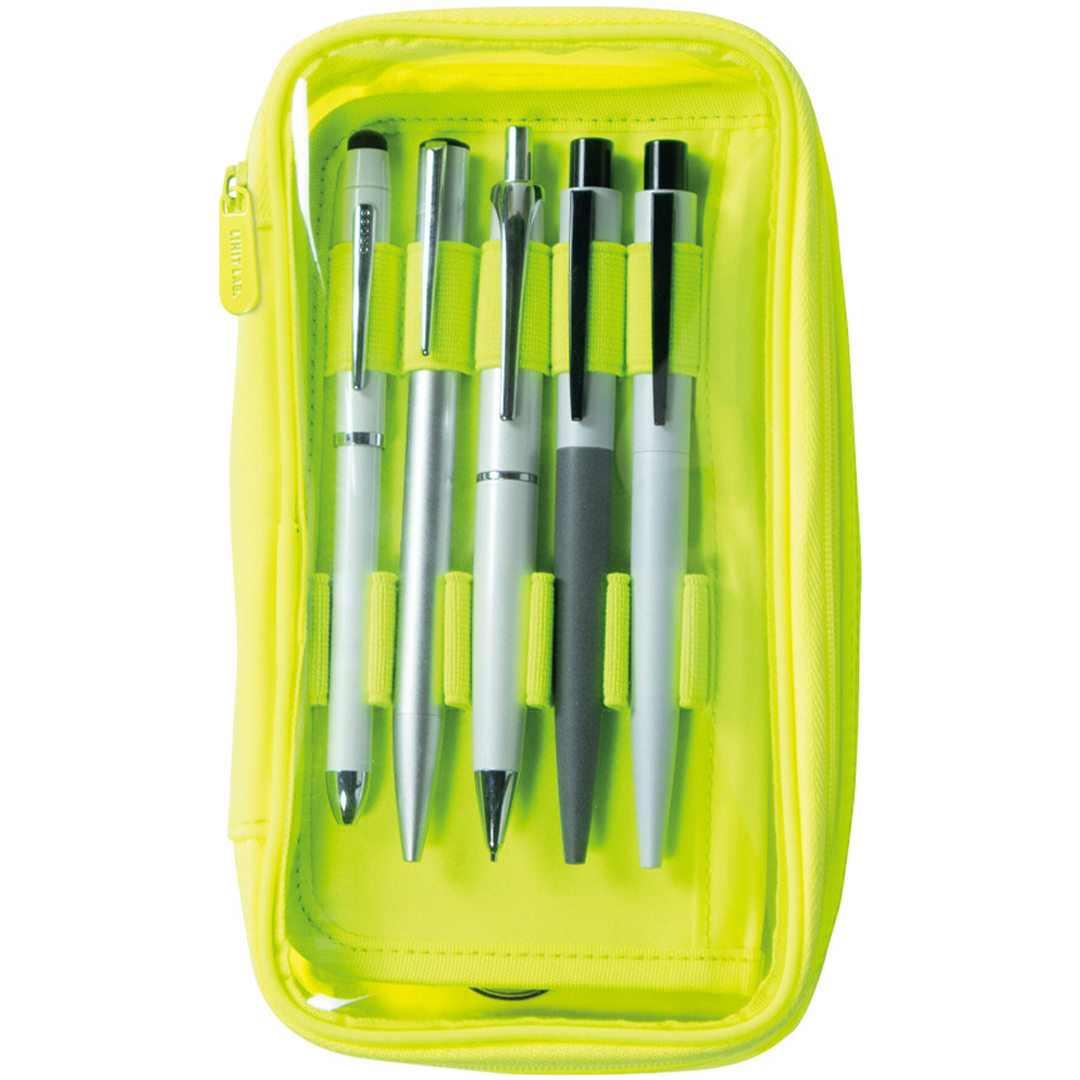 De pennenetui heeft houders voor vijf pennen, netzakjes voor gummen of andere kleine spullen en elastische banden die dunne accessoires zoals linialen op hun plaats houden. Onder de plaat is ook ruimte voor kleine bureauaccessoires. Wordt zonder inhoud geleverd.