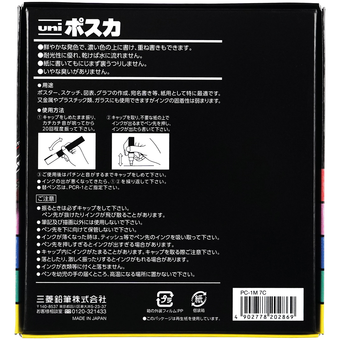 Uni Posca is een watergebaseerde dekkende kleurpen met pigmenten die hechten op een scala aan oppervlakken zoals papier, karton, hout, steen, textiel, glas, plastic en metaal. De kleur is permanent op veel poreuze ondergronden en kan van gladde oppervlakken verwijderd worden, wat experimenteren zonder het ondergrond te beschadigen mogelijk maakt. De kleur droogt snel, is geurloos en geschikt voor zowel spontane knutselprojecten als geavanceerdere artistieke werken.