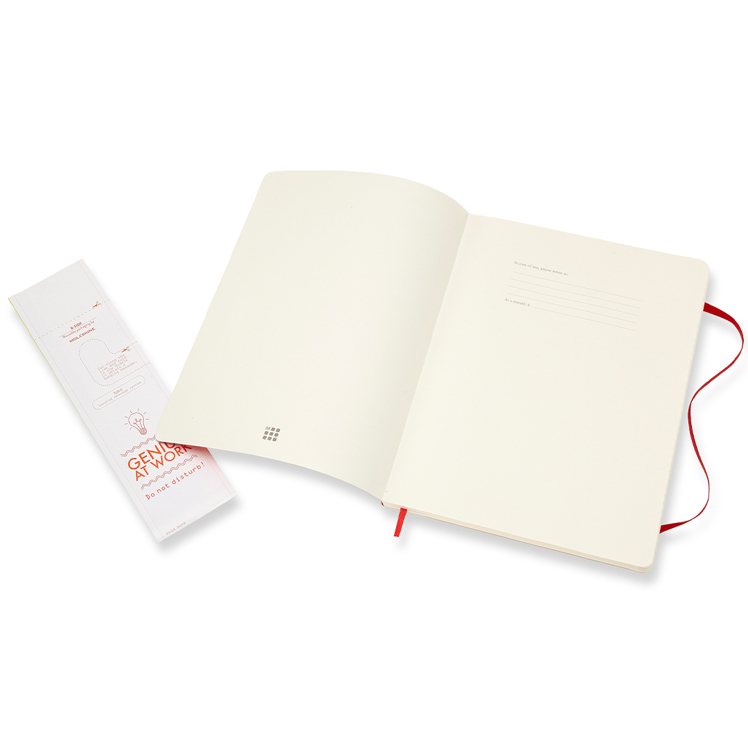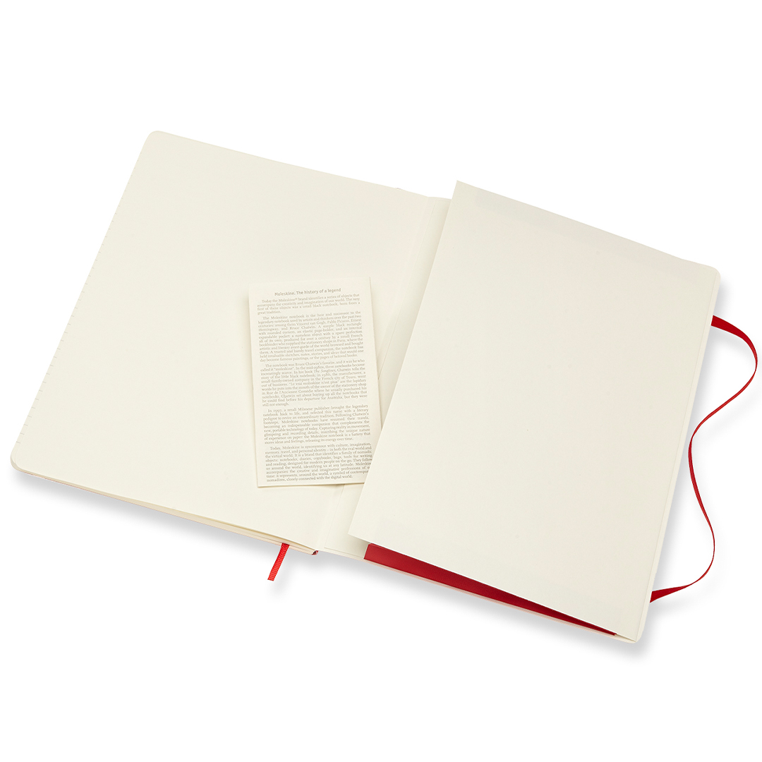 Notitieboek met zacht flexibel kaft in XL-formaat (19 x 25 cm) van het Italiaanse Moleskine. Het notitieboek bevat 192 pagina's en heeft een uitbreidbare binnenzak plus een elastiek dat het boek gesloten houdt wanneer het niet gebruikt wordt. Het ivoorkleurige papier is FSC-g gecertificeerd, zuurvrij en van hoge kwaliteit!