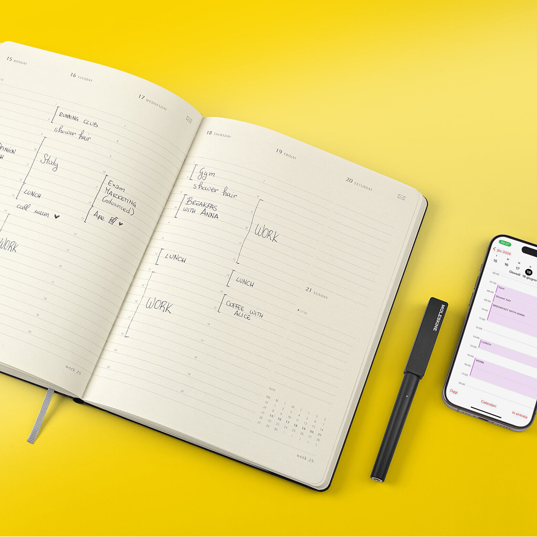 Met datums van januari tot december 2026 worden alle weekdagen verticaal op een spread gepresenteerd. De Moleskine Smart Pro Digital Planner bevat bovendien to-do-lijsten en secties gewijd aan projecten, doelen en taken – alles om zowel het professionele als het dagelijks leven te vereenvoudigen.