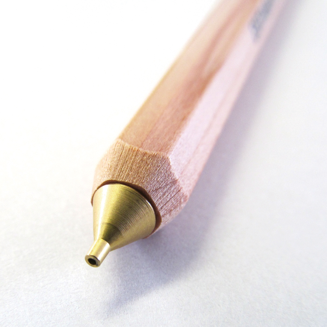 Pennenkop van natuurlijk cederhout met satijnen lakafwerking. Geïntegreerd gum. Navulbaar met 0,5 mm stiften. Geproduceerd in Japan.