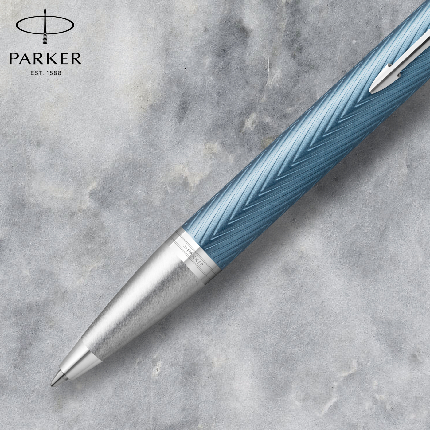 Opvallende blauwe metallic lak met een gegraveerd chevron patroon en chroomdetails. Te vullen met Parkers eigen balpenvullingen. Wordt geleverd in een eenvoudigere geschenkverpakking met een vulling erin. Deze variant is ook verkrijgbaar als rollerball of vulpen.