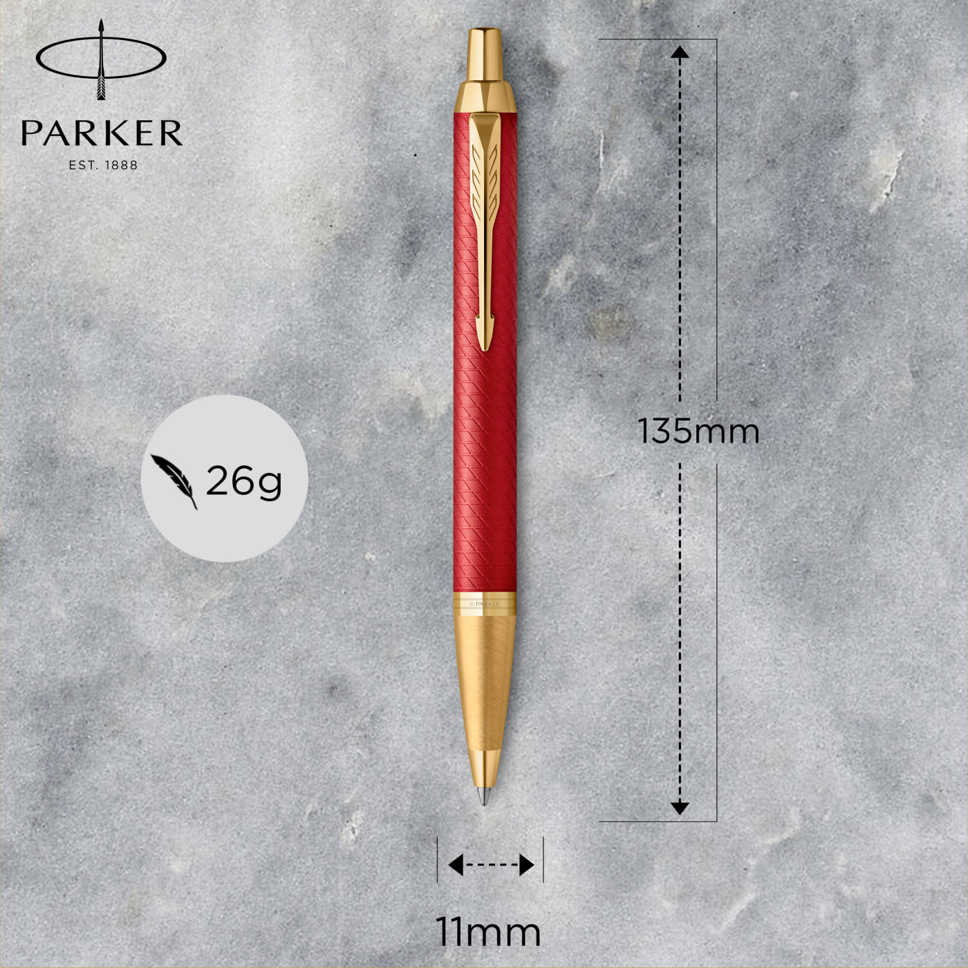 Rode matte lak met een gegraveerd ruitpatroon en vergulde details. Te vullen met Parkers eigen balpenvullingen. Wordt geleverd in een eenvoudigere geschenkverpakking met een vulling erin. Deze variant is ook verkrijgbaar als rollerball of vulpen.