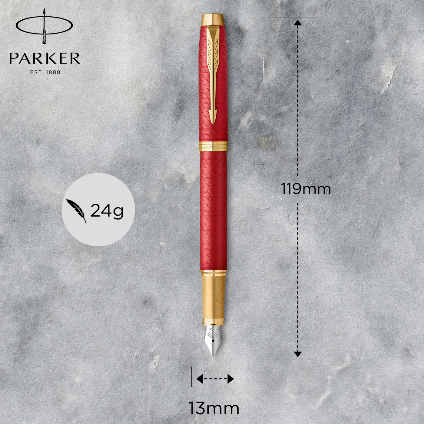Rode matte lak met een gegraveerd ruitpatroon en vergulde details. Te vullen met Parkers eigen vulpenvullingen of converter. Wordt geleverd in een eenvoudigere geschenkverpakking met een vulling erin. Deze variant is ook verkrijgbaar als rollerball of balpen.