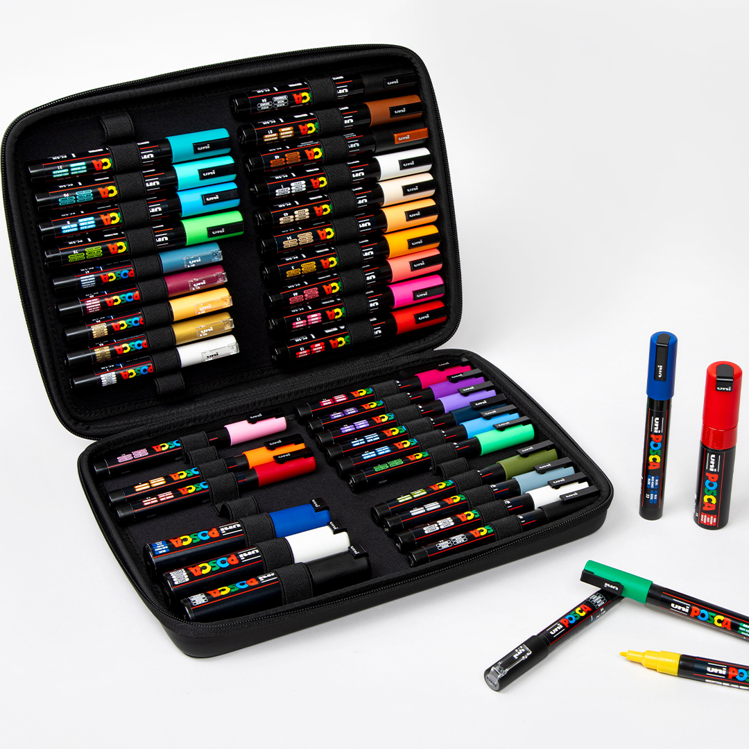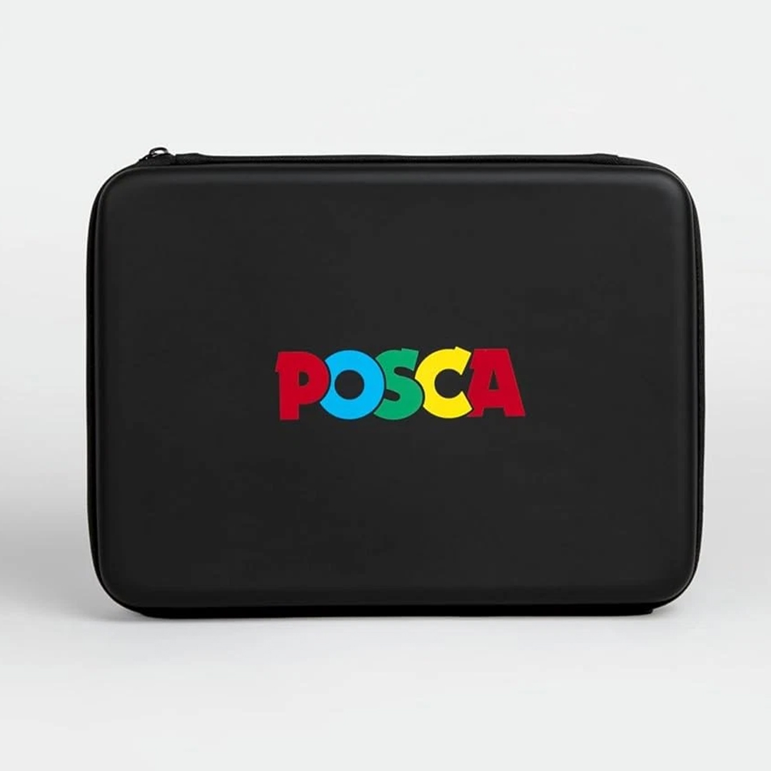 Wordt geleverd in een stevige, hoogwaardige etui met ritssluiting. De buitenkant is hard met een rubberen afwerking en het Posca-logo.