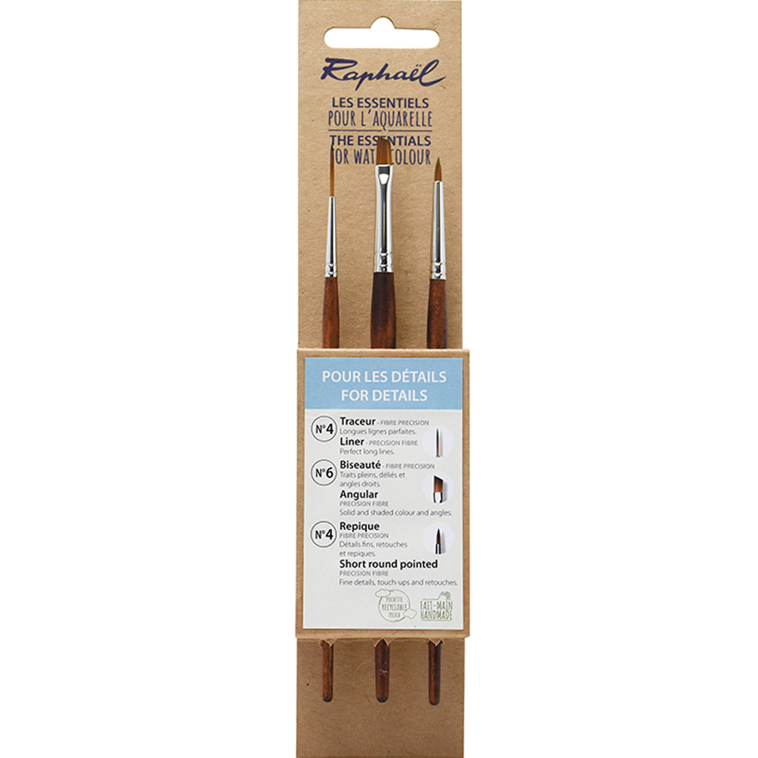 De set bevat drie kwasten: Precision Short round pointed nr. 4, Precision Liner nr. 4, Precision Angular nr. 6.