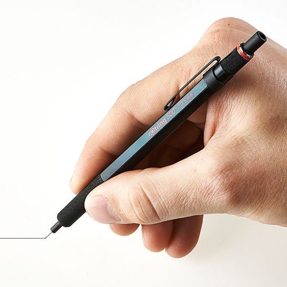 Rotring 500 vulpotlood. Een zwarte, zeshoekige plastic huls met een afneembare clip van metaal. Een gummetje aan het uiteinde. Een cilindervormige handgreep met ribbels. Door aan de top van het vulpotlood te draaien, kun je aangeven welke hardheidsgraad de vulling heeft.
