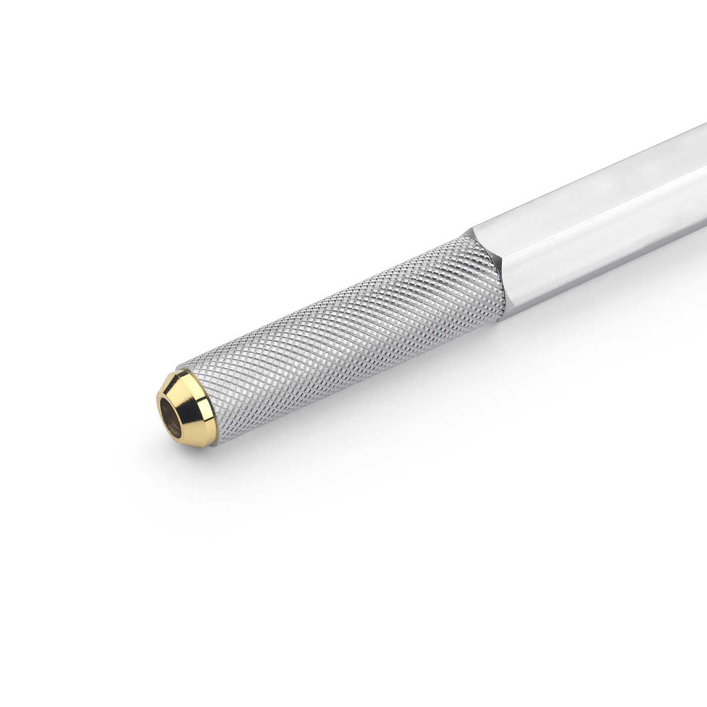 Rotring 800 vormt de volgende stap in de evolutie van de klassieke vulpotloden en balpennen van Rotring. De penhuls is gemaakt van messing, zodat de pen evenwichtig aanvoelt en prettig in de hand ligt. Door aan het topje van de pen te draaien, komt de balpenpunt tevoorschijn. Nu kun je gaan schrijven. De bovenkant van de pen is zeshoekig, terwijl de onderkant een ribbelpatroon heeft. Dit geeft de pen een extreem goede grip en verhoogt de precisie.