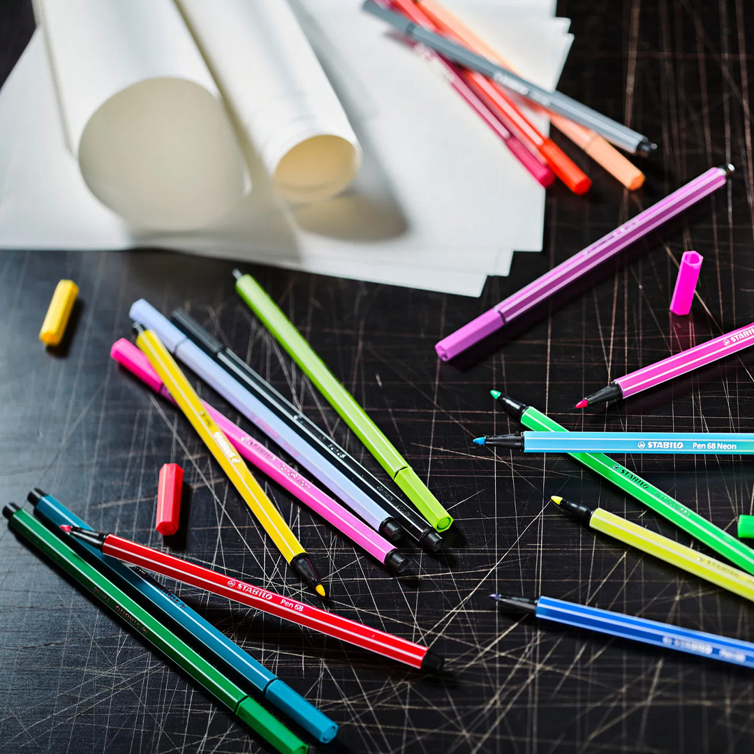 Er zijn veel verschillende sets van de Stabilo Pen 68 in sterke, levendige kleuren.