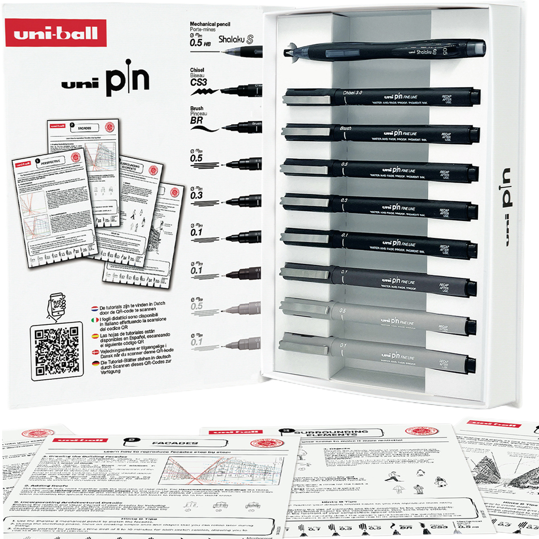 - 8 x Uni Pin Fine Line: Zwart 0,1 mm / 0,3 mm / 0,5 mm – Lichtgrijs 0,1 mm / 0,5 mm – Donkergrijs 0,1 mm – Zwarte brush pen en schuin afgesneden punt