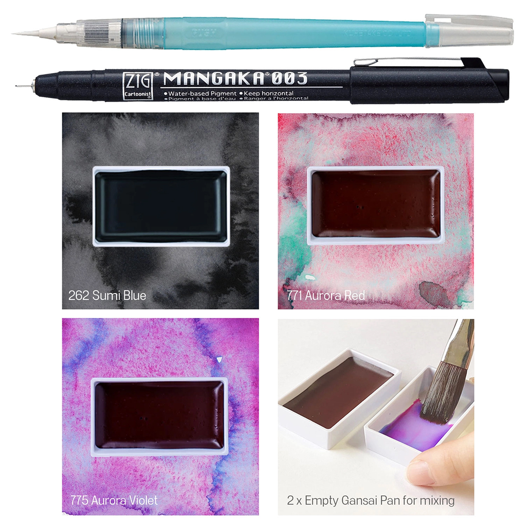- 2 Gansai Tambi Granulerende kleuren: Aurora Red (771) / Aurora Violet (775)